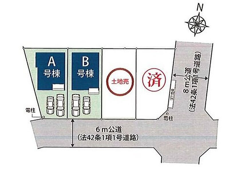 | 駐車場 | 2台 | 道路の幅員 | 道路幅:6m・8m、アスファルト舗装、南側6m公道、東側8m公道 |
