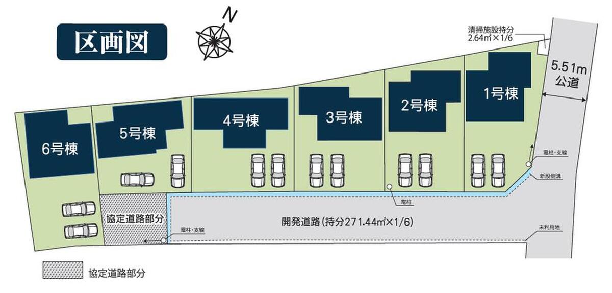 | 駐車場 | 2台 | 道路の幅員 | 道路幅:5.5m・6m、アスファルト舗装、北東側5.51m公道、南東側6m私道 |