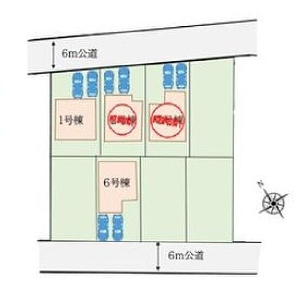 | 駐車場 | 2台 | 道路の幅員 | 道路幅:6m、アスファルト舗装、北東側6m公道、南西側6m公道 |