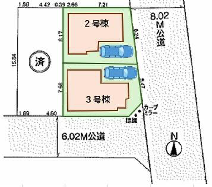 | 駐車場 | 1台 | 道路の幅員 | 道路幅:5.9m~8m、アスファルト舗装、東側8.02m公道、南側5.98m公道 |