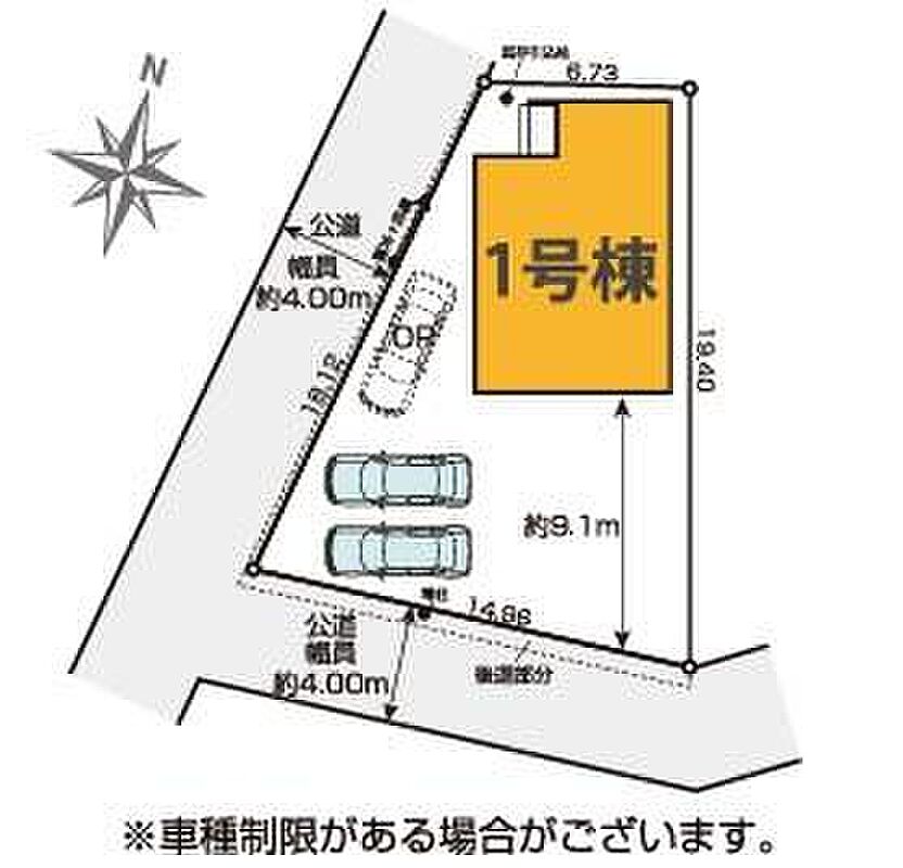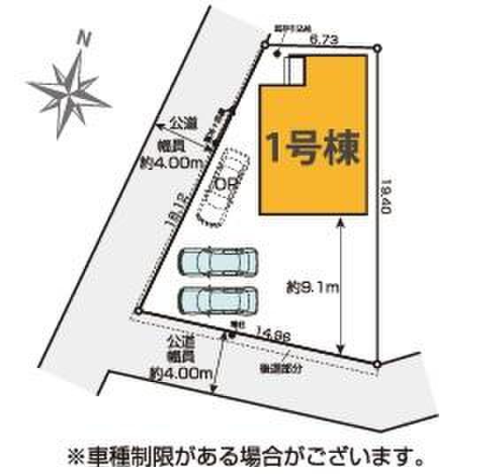 | 駐車場 | 2台 ~ 3台(車種による) | 道路の幅員 | 道路幅:4m、アスファルト舗装、西側約4m公道、南側約4m公道 |