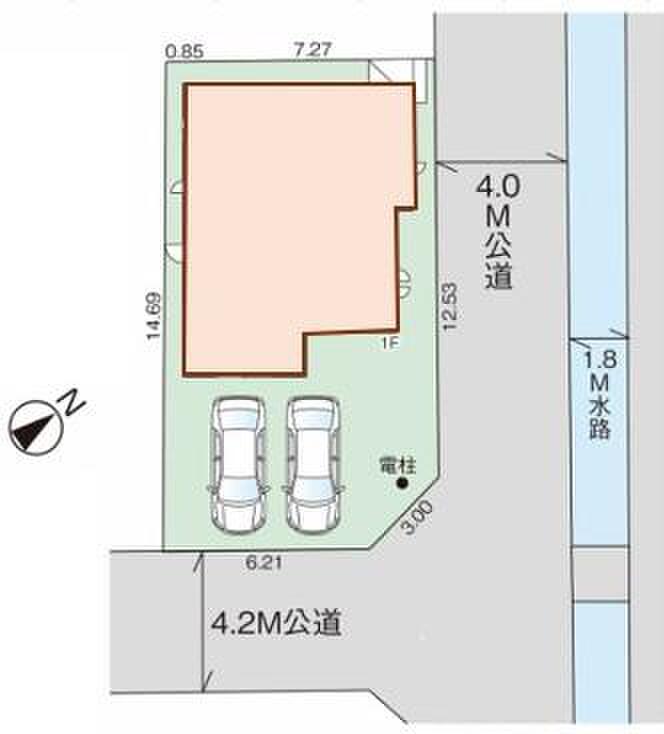 | 駐車場 | 2台 | 道路の幅員 | 道路幅:4m・4.2m、アスファルト舗装、北東側4m公道、南東側4.2m公道 |