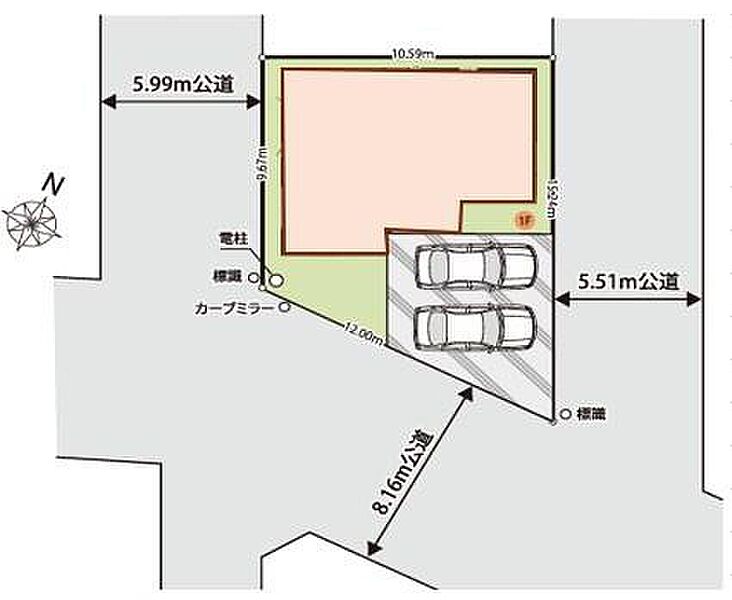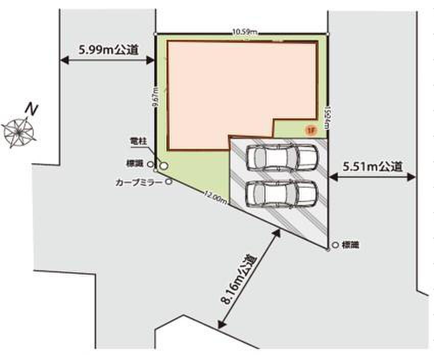 | 駐車場 | 2台 | 道路の幅員 | 道路幅:5.5m~8m、アスファルト舗装、南東側8.02m公道、南西側5.99m公道、北東側5.5m |
