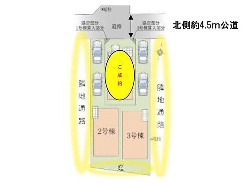 | 駐車場 | 2台 | 道路の幅員 | 道路幅:4.5m、アスファルト舗装、北側約4.5m公道 |