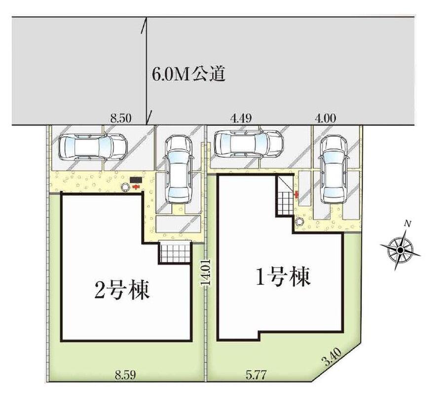 | 駐車場 | 2台 | 道路の幅員 | 道路幅:6m、アスファルト舗装、北西側6m公道 |