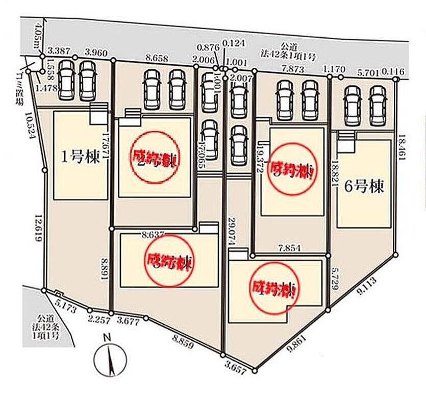 | 駐車場 | 2台 | 道路の幅員 | 道路幅:4m、アスファルト舗装、北側4.05m公道 |