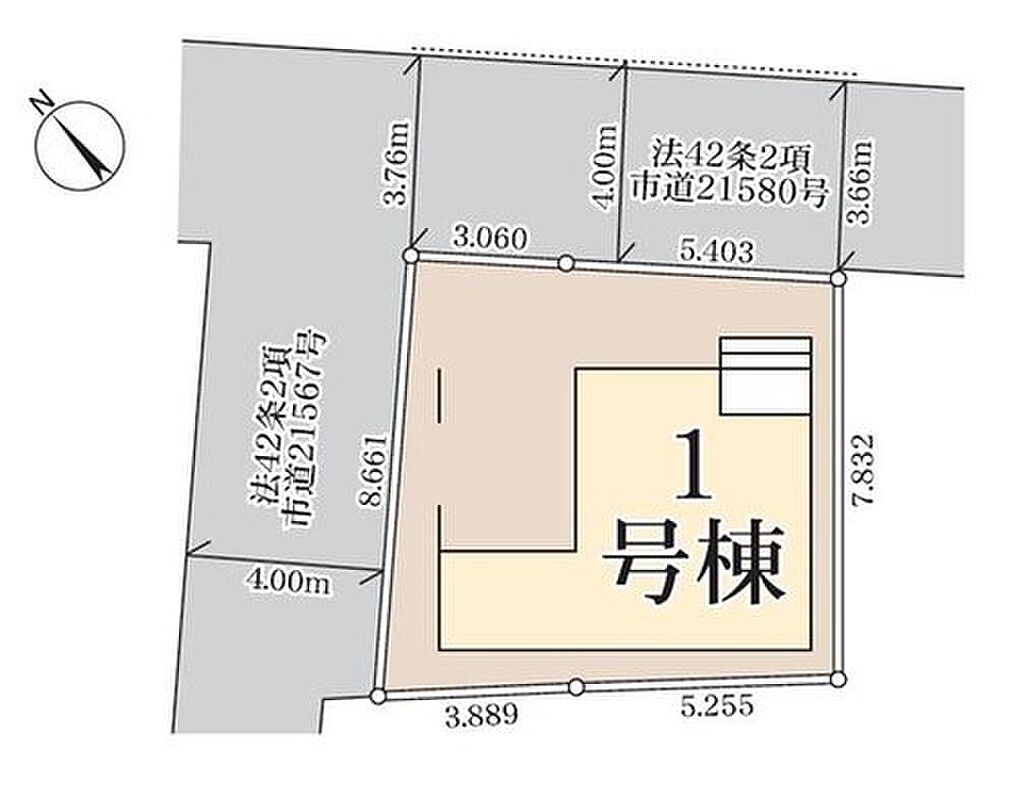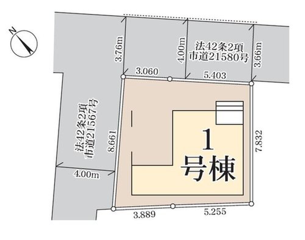 | 駐車場 | 1台 | 道路の幅員 | 道路幅:4m、アスファルト舗装、北東側4m公道、北西側4m公道 |