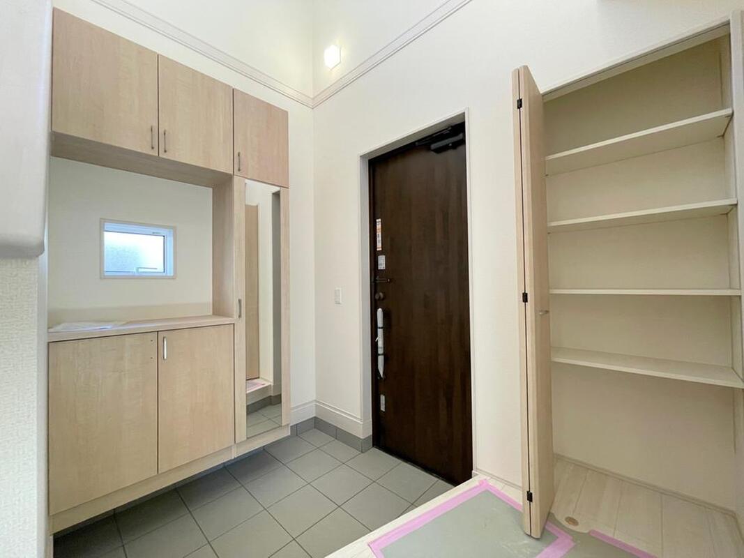 吹抜けのある玄関は、開放感と明るさで溢れた空間。たっぷりの収納と姿見鏡でお出かけ前の身支度にもお役立ちします。