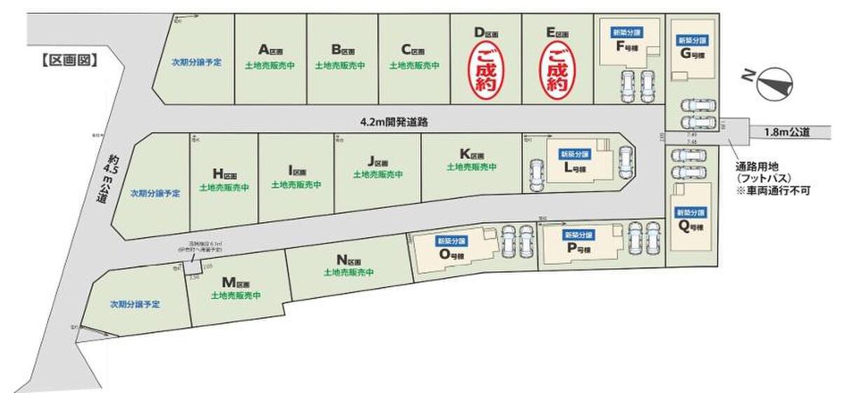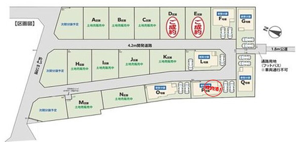 | 駐車場 | 2台 | 道路の幅員 | 道路幅:4.2m、アスファルト舗装、北西側約4.2m開発道路(私道) |