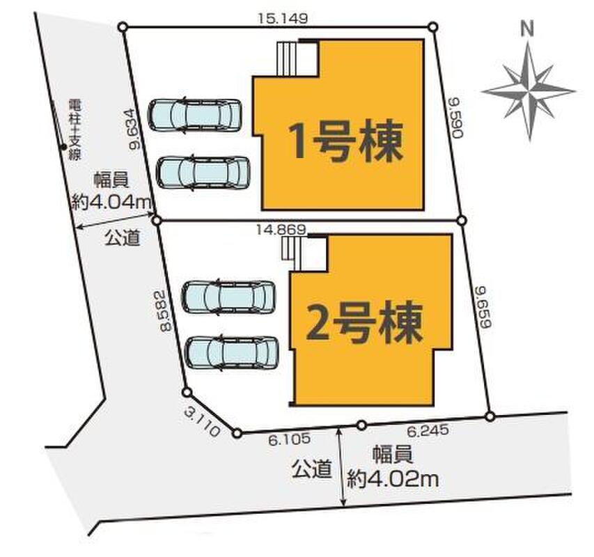 | 駐車場 | 2台 | 道路の幅員 | 道路幅:4m、アスファルト舗装、1号棟:西側約4m 公道、2号棟:西側約4m 公道、南側約4m 公道 |