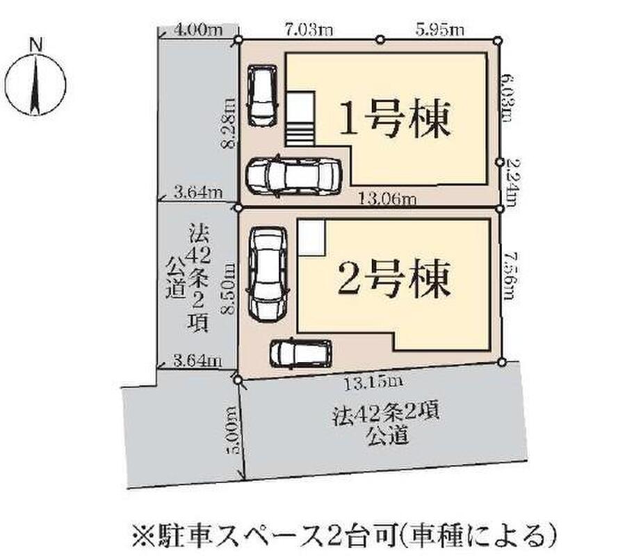 | 駐車場 | 2台 | 道路の幅員 | 道路幅:4m~5m、アスファルト舗装、西側4m公道、南側5m公道 |