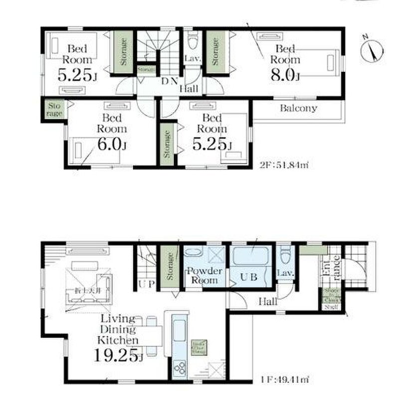 | 建物面積 | 95.58m2~101.25m2(28.91坪~30.62坪)(実測) | 土地面積 | 97.4m2~98.78m2(29.46坪~29.88坪)(実測) |