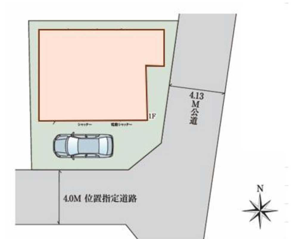 | 駐車場 | 1台 | 道路の幅員 | 道路幅:4m~4.3m、アスファルト舗装、南側4m公道、東側4.3m公道 |