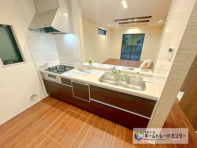 人工大理石トップのシステムキッチン。見栄えもよくお手入れもスムーズに出来ます。豊富な収納力もございますので、キッチンスペースをスッキリとお使い頂けそうです。