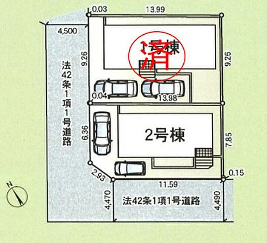 | 駐車場 | 2台(※2号棟車種による) | 道路の幅員 | 道路幅:4.4m~4.5m、アスファルト舗装 |