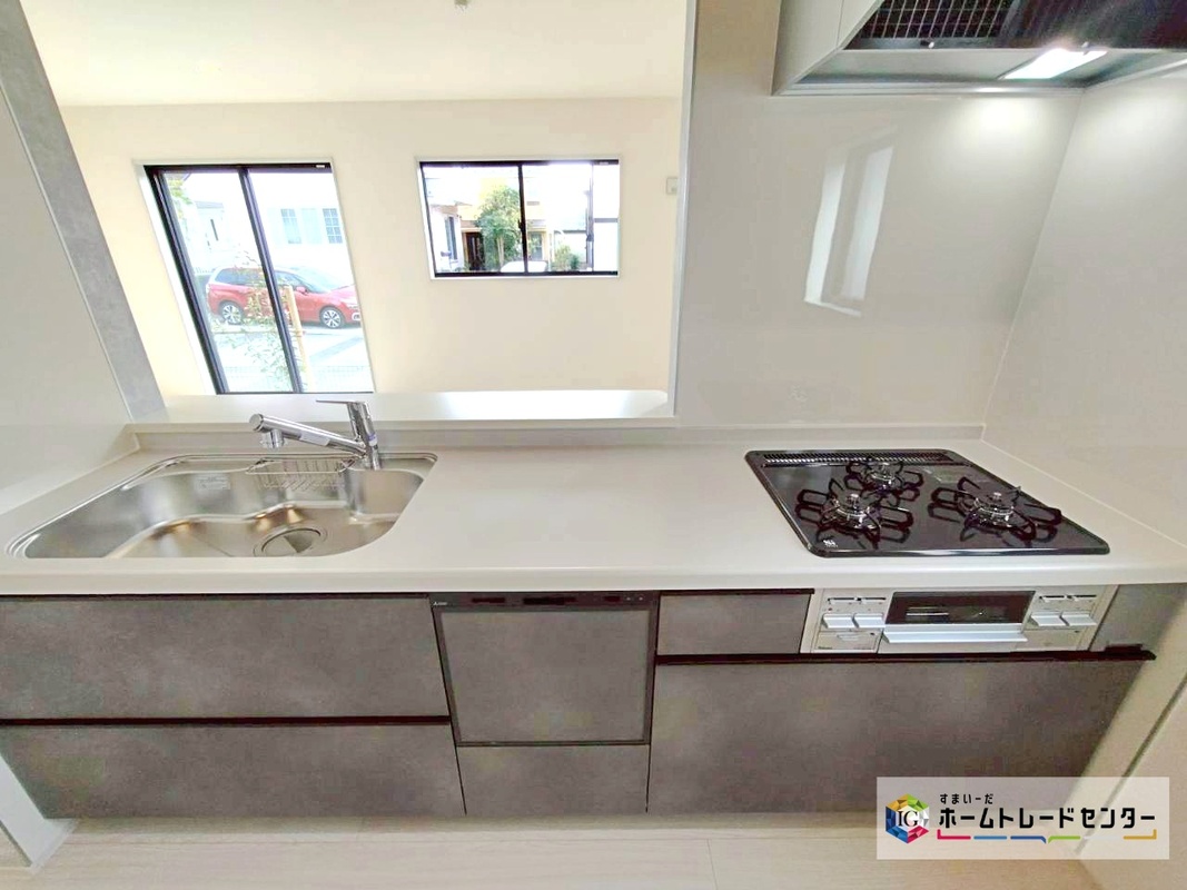 人工大理石トップのシステムキッチン。見栄えもよくお手入れもスムーズに出来ます。豊富な収納力もございますので、キッチンスペースをスッキリとお使い頂けそうです。嬉しい食洗機付♪