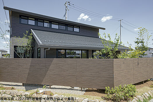 ■物件について・大屋根に包まれ暮らす住まい。そこはまるで、大きな樹の下に広がる木陰の暮らし。・庭に向けて大開口を設けていますが、深い軒と目隠しフェンスによりお庭の解放感とプライバシーを両立!