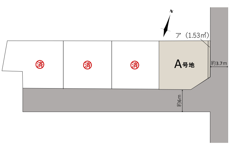 | 建物面積 | 103.72m2 | 土地面積 | 168.85m2私道負担有り位置指定道路(311m2)のうち1/4ずつ共有していただきます●セットバック部分(ア(1.53m2)を購入された方に所有していただきます |