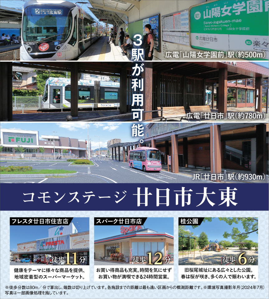 広電「廿日市」駅へ徒歩10分。広電「山陽女学園前」駅へ徒歩7分。JR「廿日市」駅へ徒歩12分。フレスタ廿日市住吉店へ徒歩11分。
