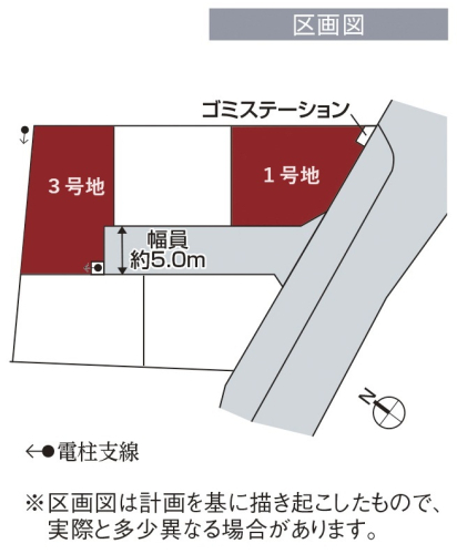| 備考 | ●団地内施設:ゴミステーション1ヶ所(1.34m2)※各号地の所有者にて共有となります。共有持分1/5。●水道分担金・建築確認申請・住宅性能評価申請等許認可申請費用は販売価格に含まれます。●良好なまちなみの形成を図るため、「まちなみガイドライン」を作成しています。 | ||