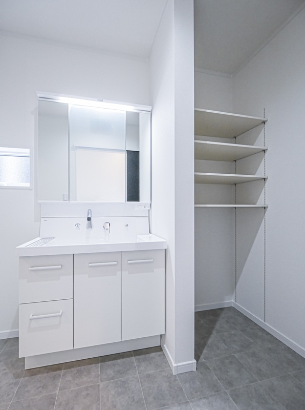 洗面化粧台は三面鏡で収納も抜群。さらにボウル一体型でつけ置き洗いなど家事にも役立ちます。