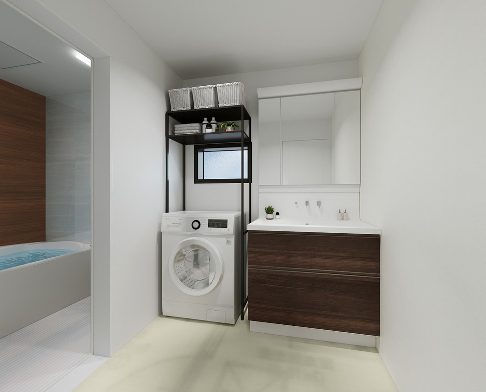 洗面化粧台は三面鏡で収納も抜群。さらにボウル一体型でつけ置き洗いなど家事にも役立ちます。