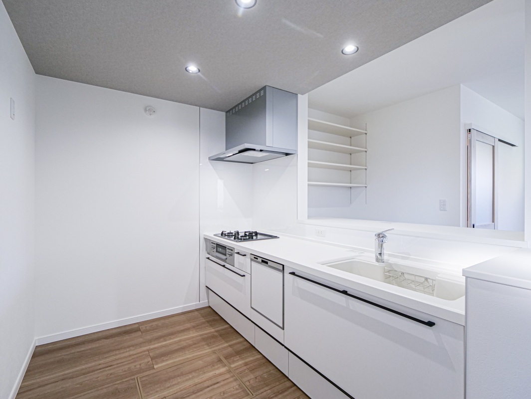 キッチン上部をおり下げ天井にしてリビング全体のアクセントになります。また、食洗器付きの高機能システムキッチンです。