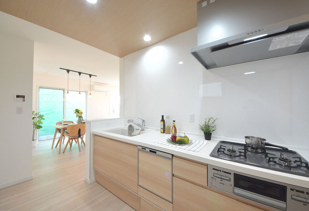 キッチンは食洗器付きでお料理後の後片付けをサポートするビルトインタイプの食器洗い乾燥機は節水にもつながります。