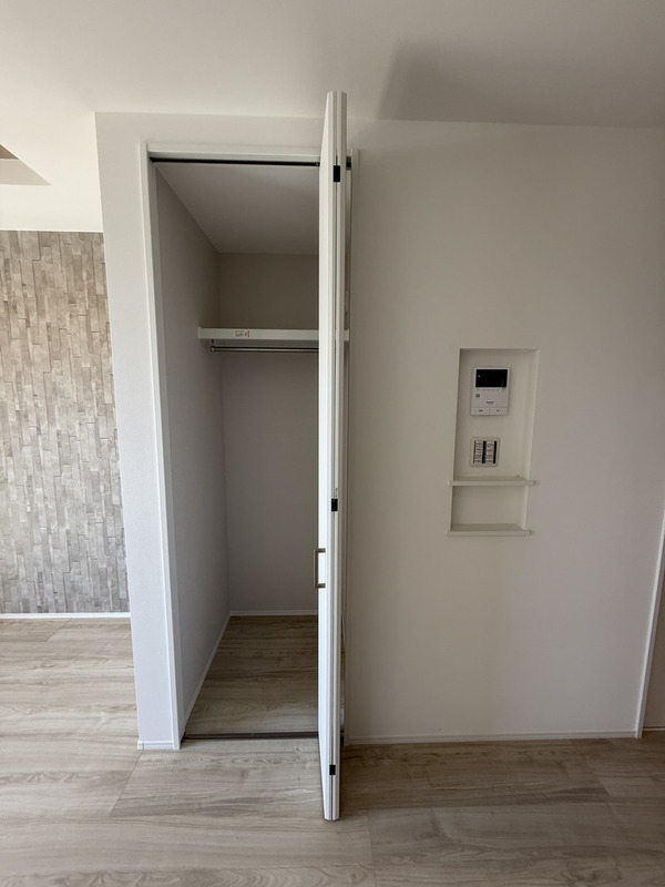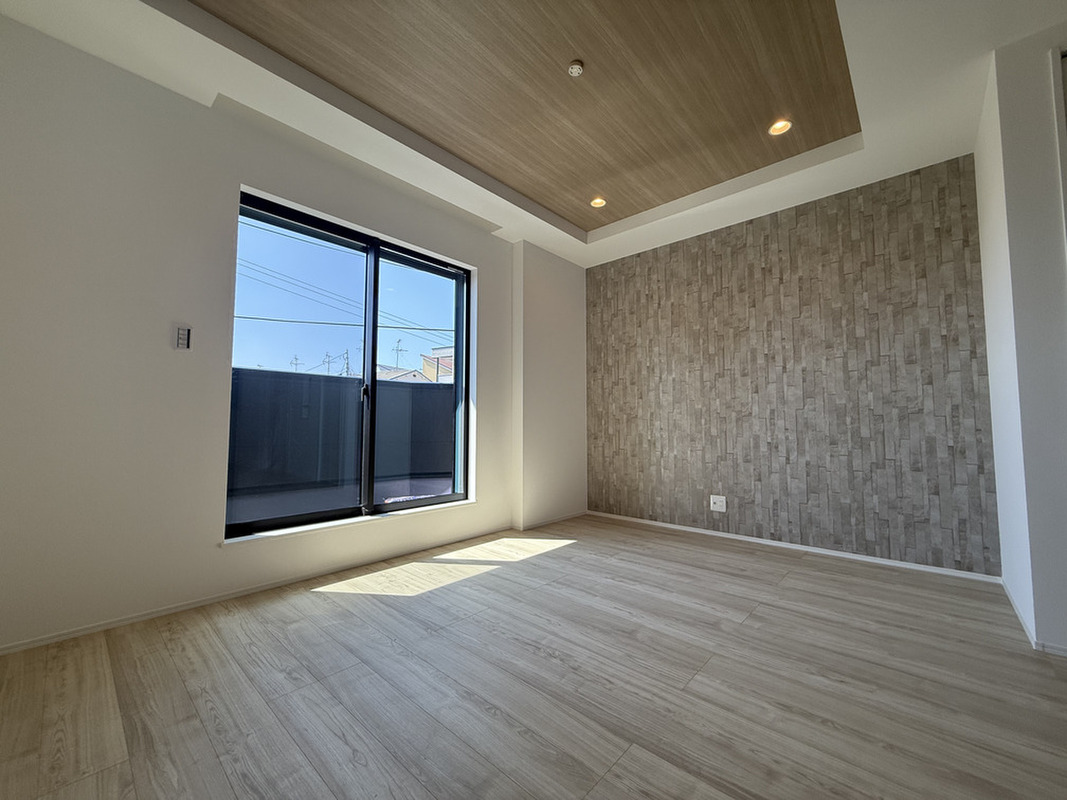 前面道路から直接視線が届かず、折上天井やアクセントクロスは落ち着いたカラーに。インターホンやスイッチ類はニッチにまとめてすっきり。カーテンボックスやダウンライトにより広さを感じられます。