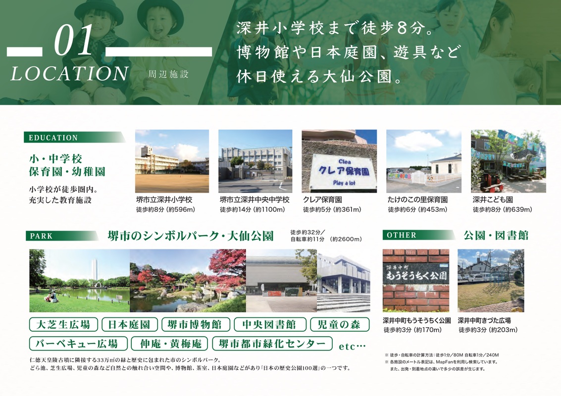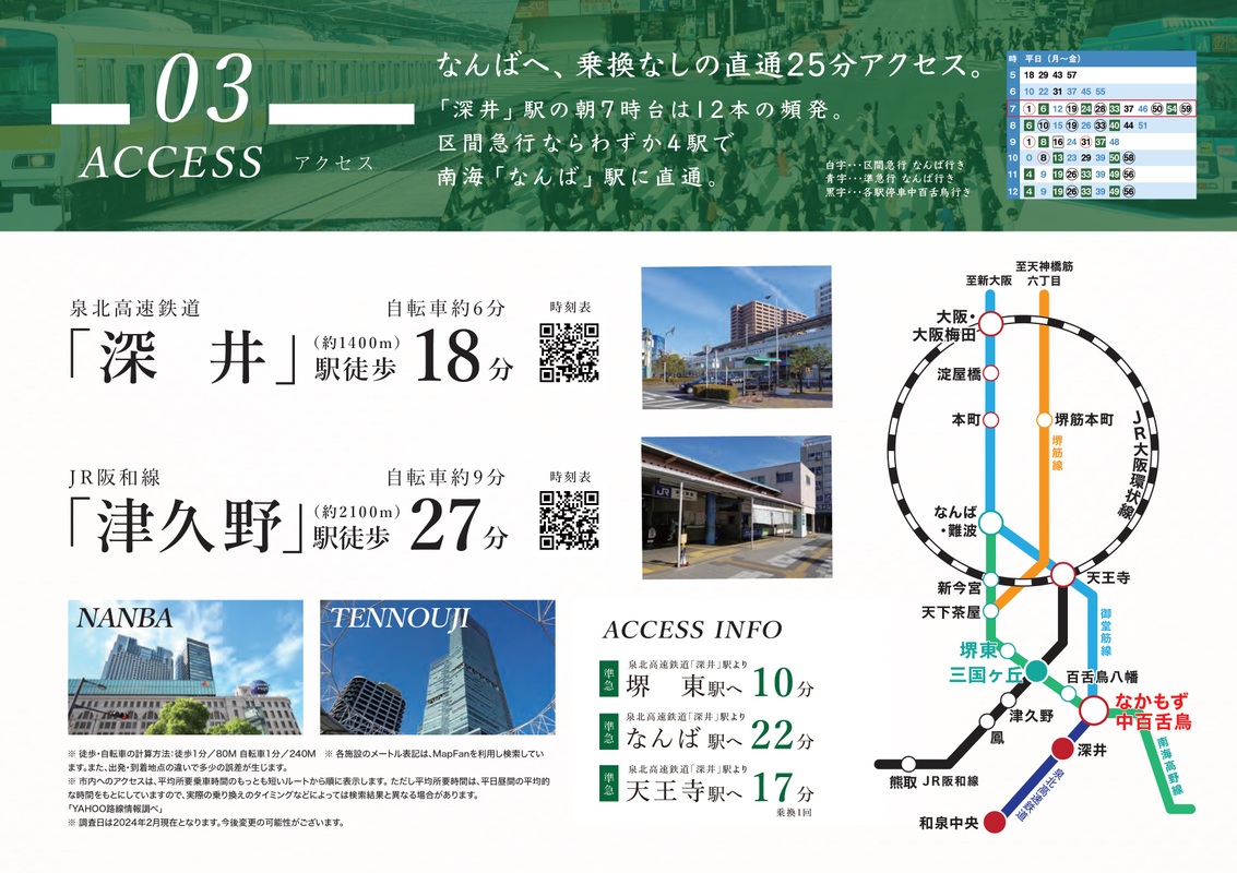 - 南海泉北線「深井」駅 徒歩18分 、自転車約6分(約1400m)JR阪和線「津久野」駅 徒歩27分 、自転車約9分(約2100m)JR阪和線「鳳」駅 徒歩35分 、自転車約12分(約2800m)