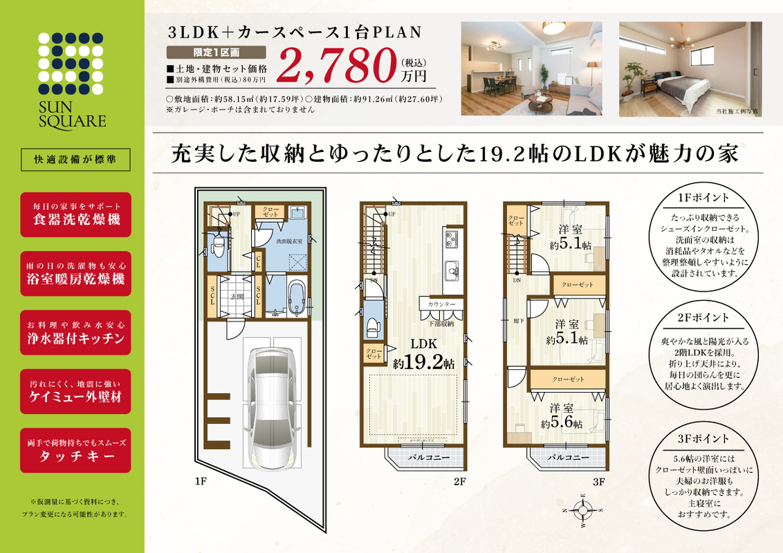 魅力2 1邸のみ!収納配置や動線にこだわり、様々な快適設備が標準装備の3階建×3LDK!