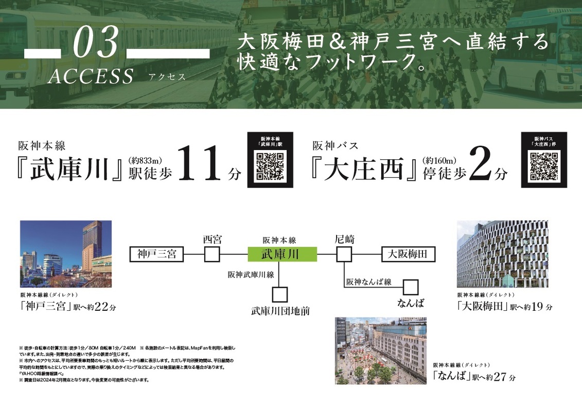 各種急行が停車し、三ノ宮方面や梅田などの主要駅へラクラク移動。発着本数も充実しています。徒歩約2分のバス停「大庄西」から阪神で屋敷方面などへ、バスアクセスも可能です。