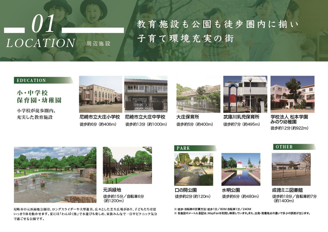幼保や公園が点在し、小学校徒歩約6分!通学がしやすく、小さなお子様との歩いての登園の負担も少ない立地です。大型公園「元浜緑地」へ自転車約6分!休日もご家族揃って楽しめます。