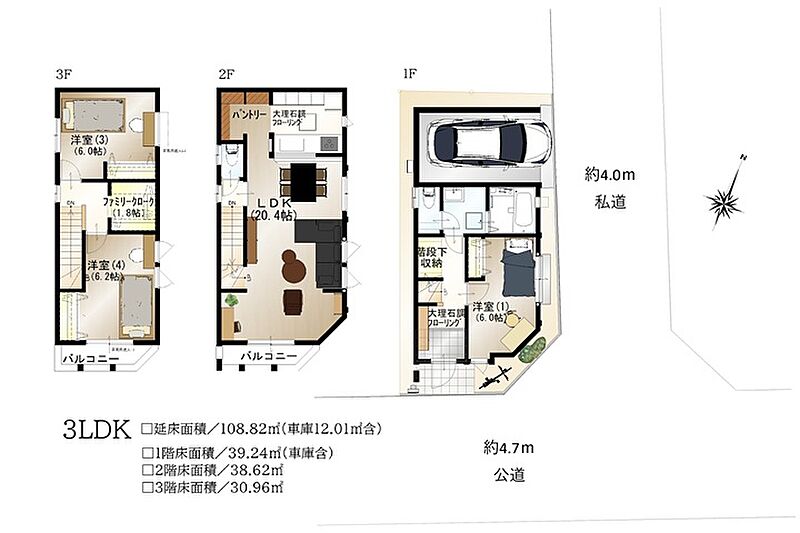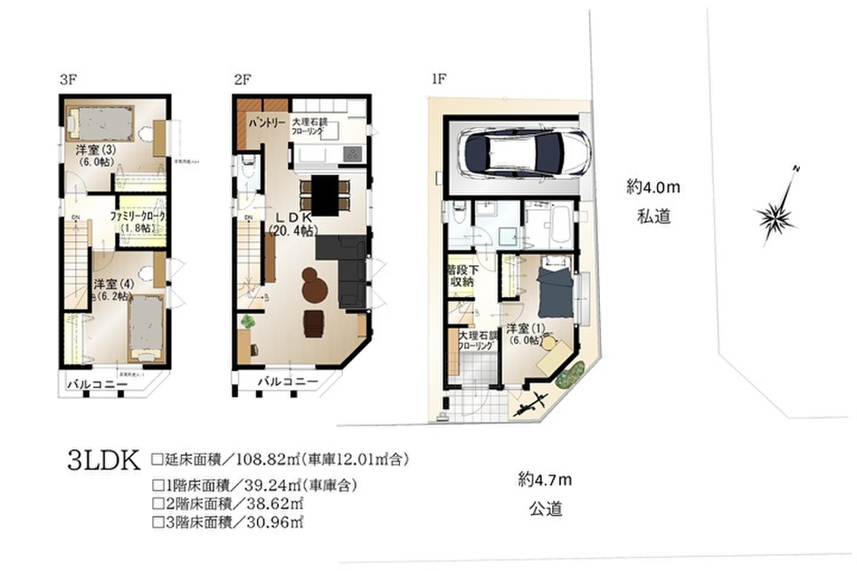 | 建物面積 | 108.82m2(1階車庫12.01m2含む) | 土地面積 | 60.76m2 |