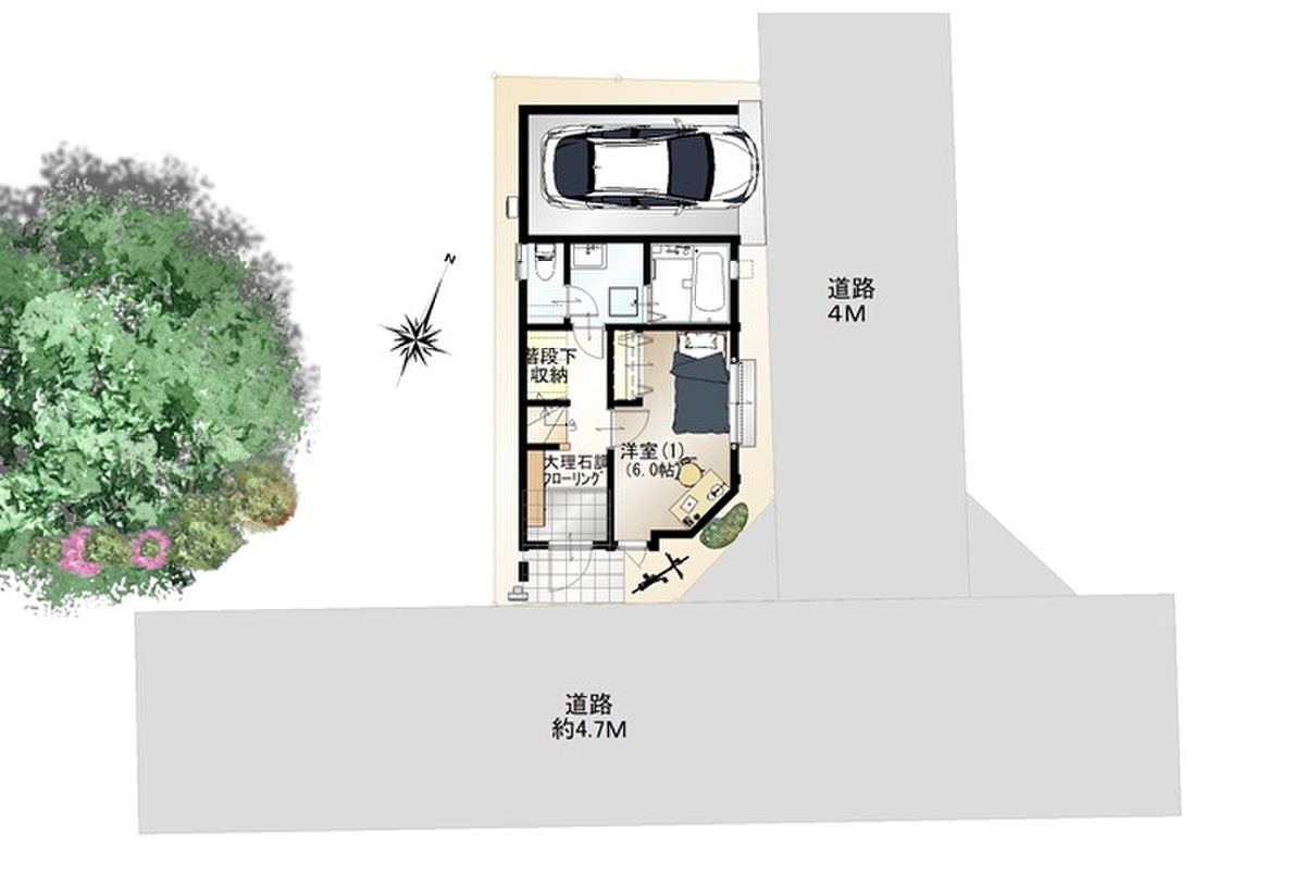 | 駐車場 | 0台 ~ 1台(ビルトインガレージ) | 道路の幅員 | 南側約4.7m、東側4.0m私道 私道負担12.80m2 |
