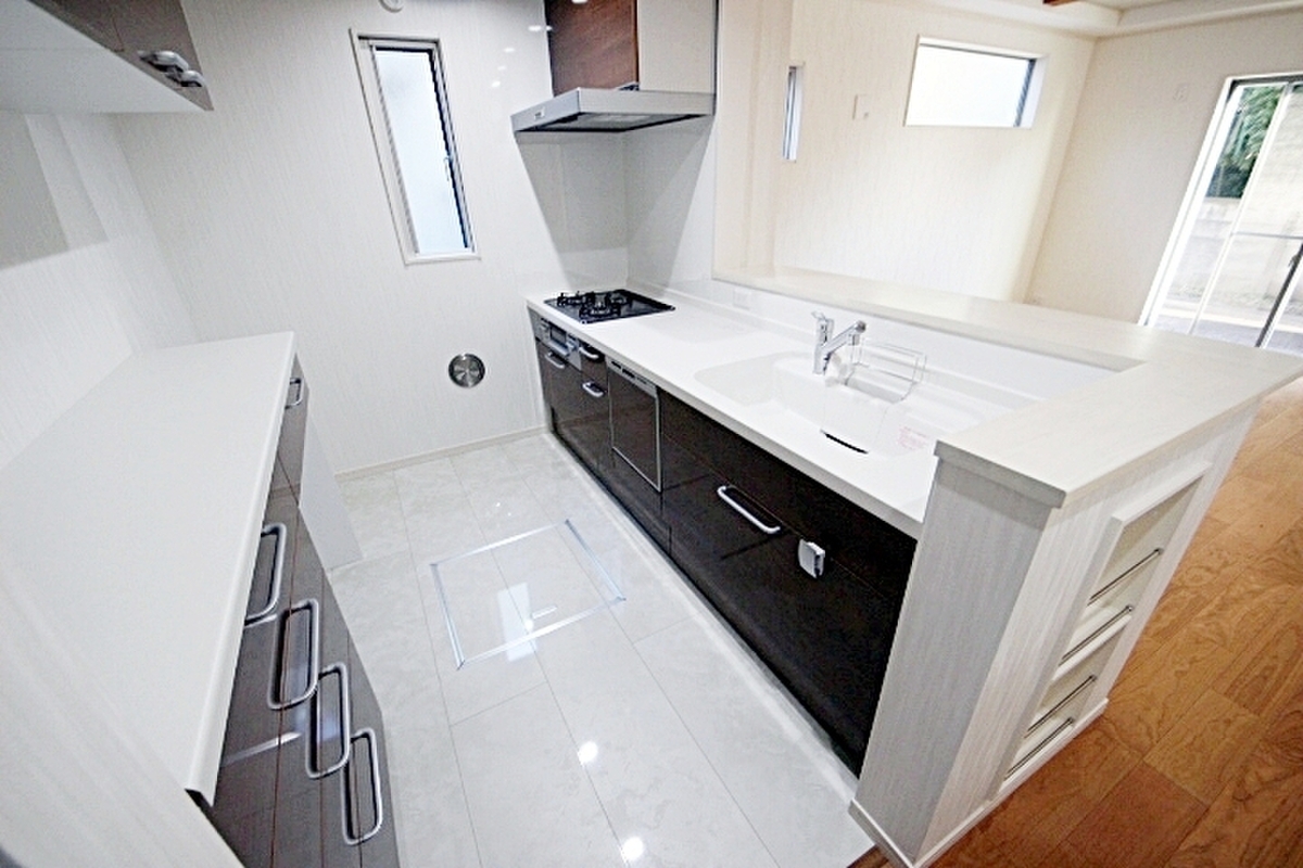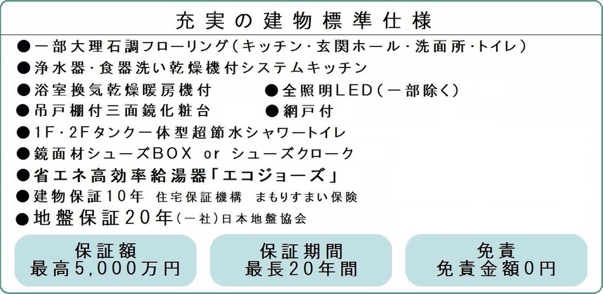 仕様:一部大理石調フローリング・ノンワックスフローリング・浄水器食洗機付キッチン・浴室換気乾燥暖房機・全窓Low-Eガラス・玄関断熱ドア(ピタットキー)・全室LED照明(一部除く)
