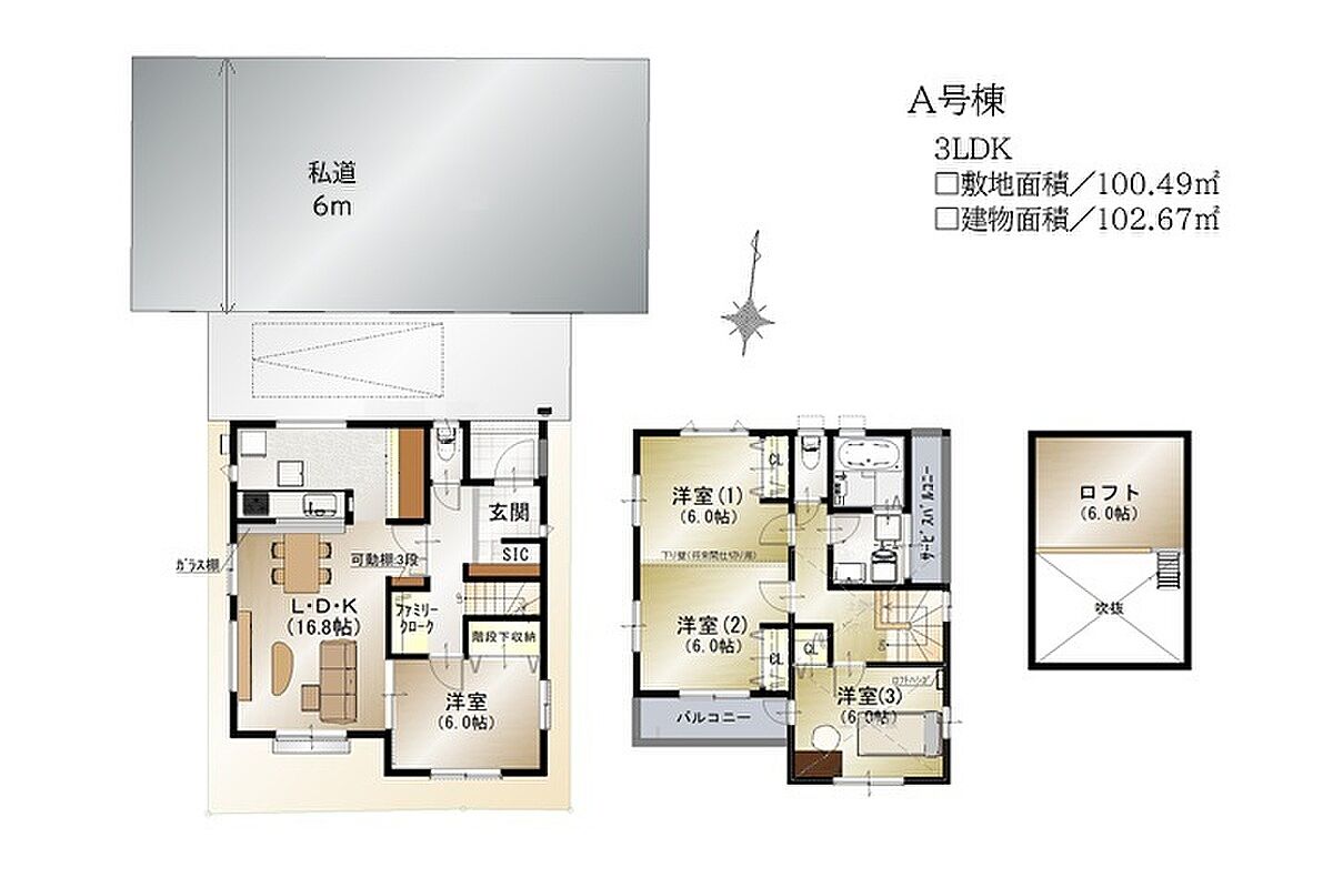 | 駐車場 | 1台(カースペース) | 道路の幅員 | 北側約6.0m私道、私道持分42.36m2 |