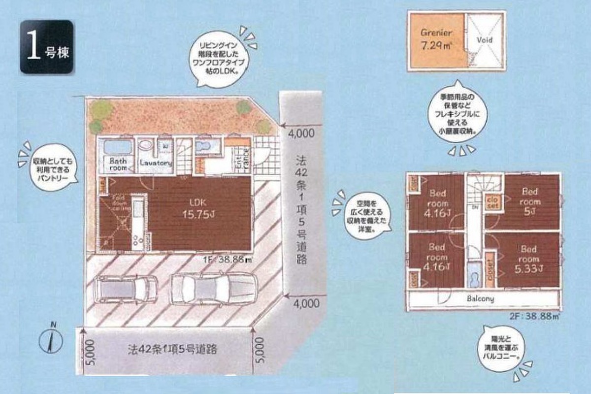 新築一戸建て 南5m道路につき陽当りと開放感良好・カースペース2台可