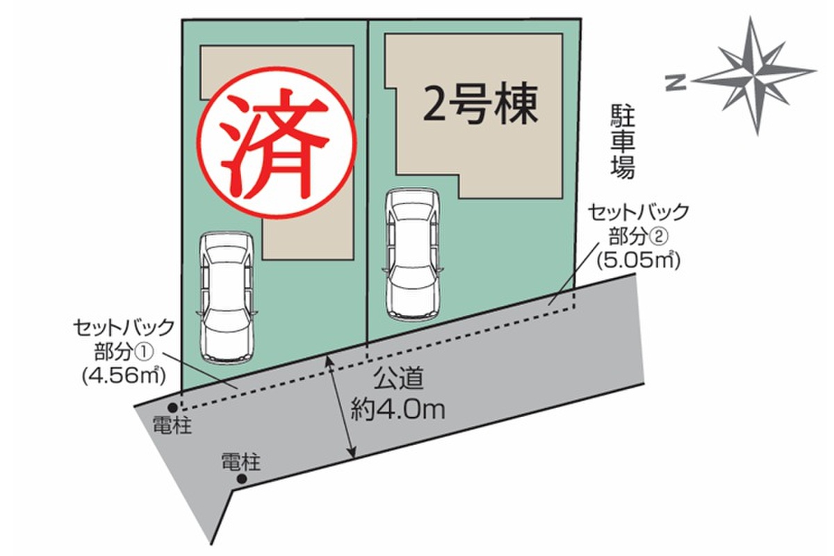 | 駐車場 | 1台(カースペース) | 道路の幅員 | 西側約4m公道(セットバック5.05m2) |