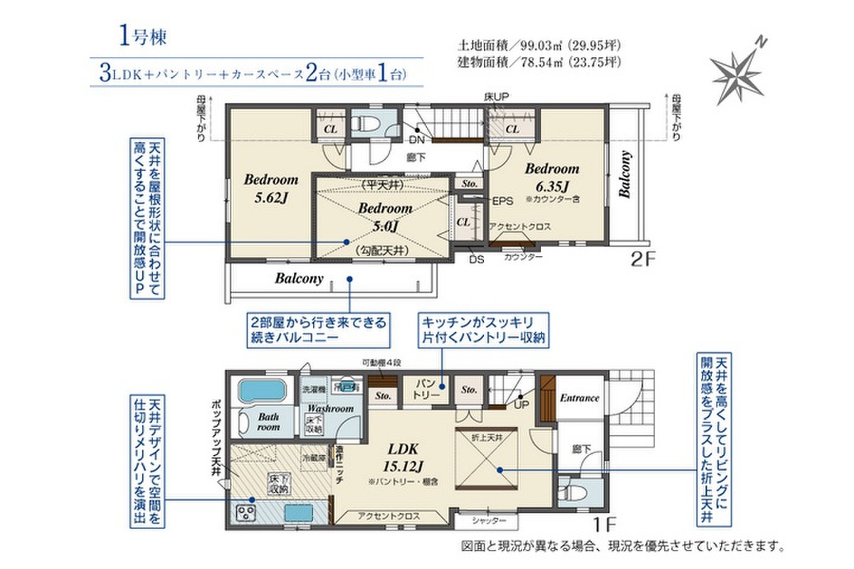 | 建物面積 | 78.54m2・79.48m2 | 土地面積 | 99.03m2・99.66m2 |