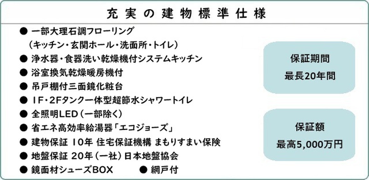 仕様:一部大理石調フローリング・ノンワックスフローリング・浄水器食洗機付キッチン・浴室換気乾燥暖房機・全窓Low-Eガラス・玄関断熱ドア(ピタットキー)・全室LED照明(一部除く)