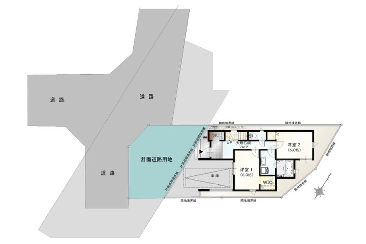 | 駐車場 | 1台(ビルトインガレージ) | 道路の幅員 | 北側4.8m公道、西側約4.2m私道 |