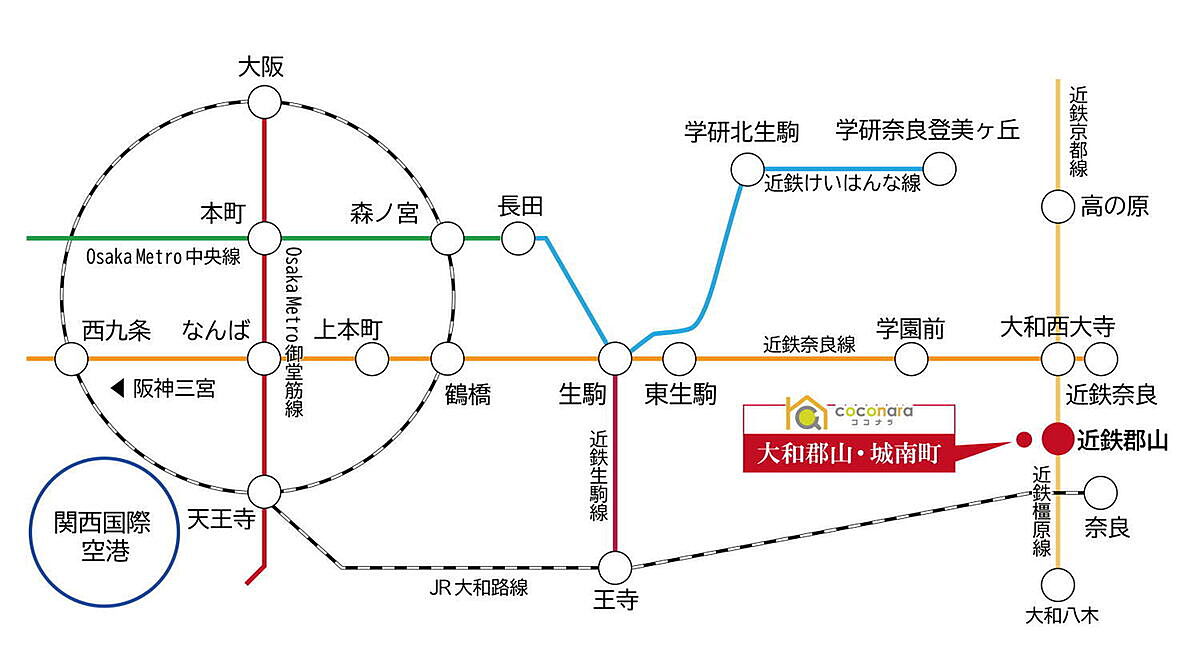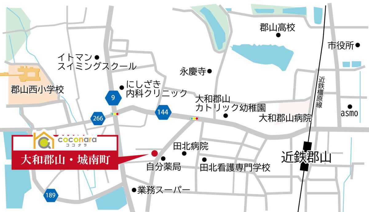近鉄橿原線「近鉄郡山」駅 徒歩8分 JR関西本線「郡山」駅 徒歩20分 近鉄橿原線「九条」駅 徒歩28分 |