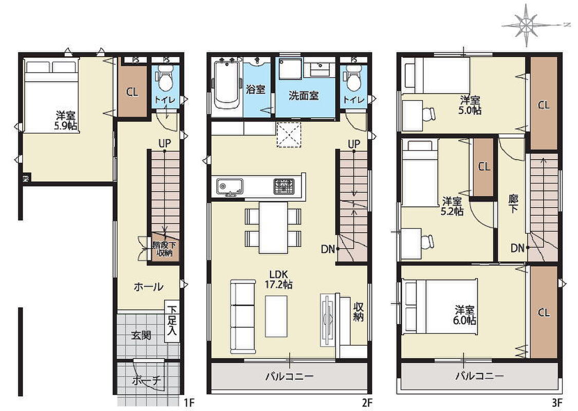 縦長3階建てでゆとりとすっきりした暮らし、落ち着く居室配置を実現!