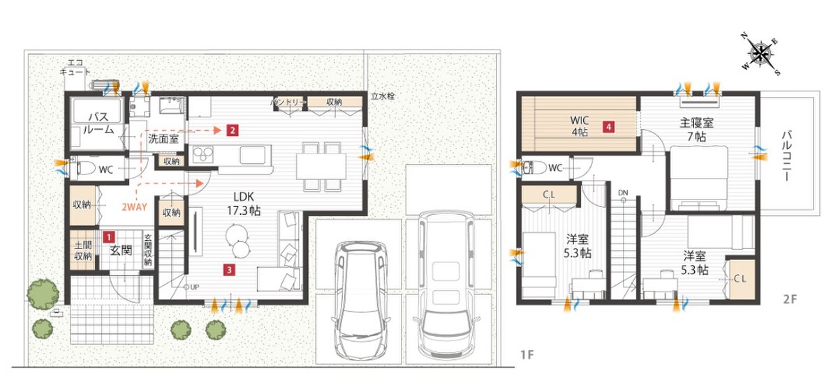 全居室南西向き×オール電化仕様の3LDKモデルです。お車2台分のほか、自転車やバイクも停めておくことができます(車種による)。アルミ樹脂複合サッシ&Low-E複層ガラスを採用。耐震等級3、断熱等性能等級5など、住宅性能にもこだわっています。