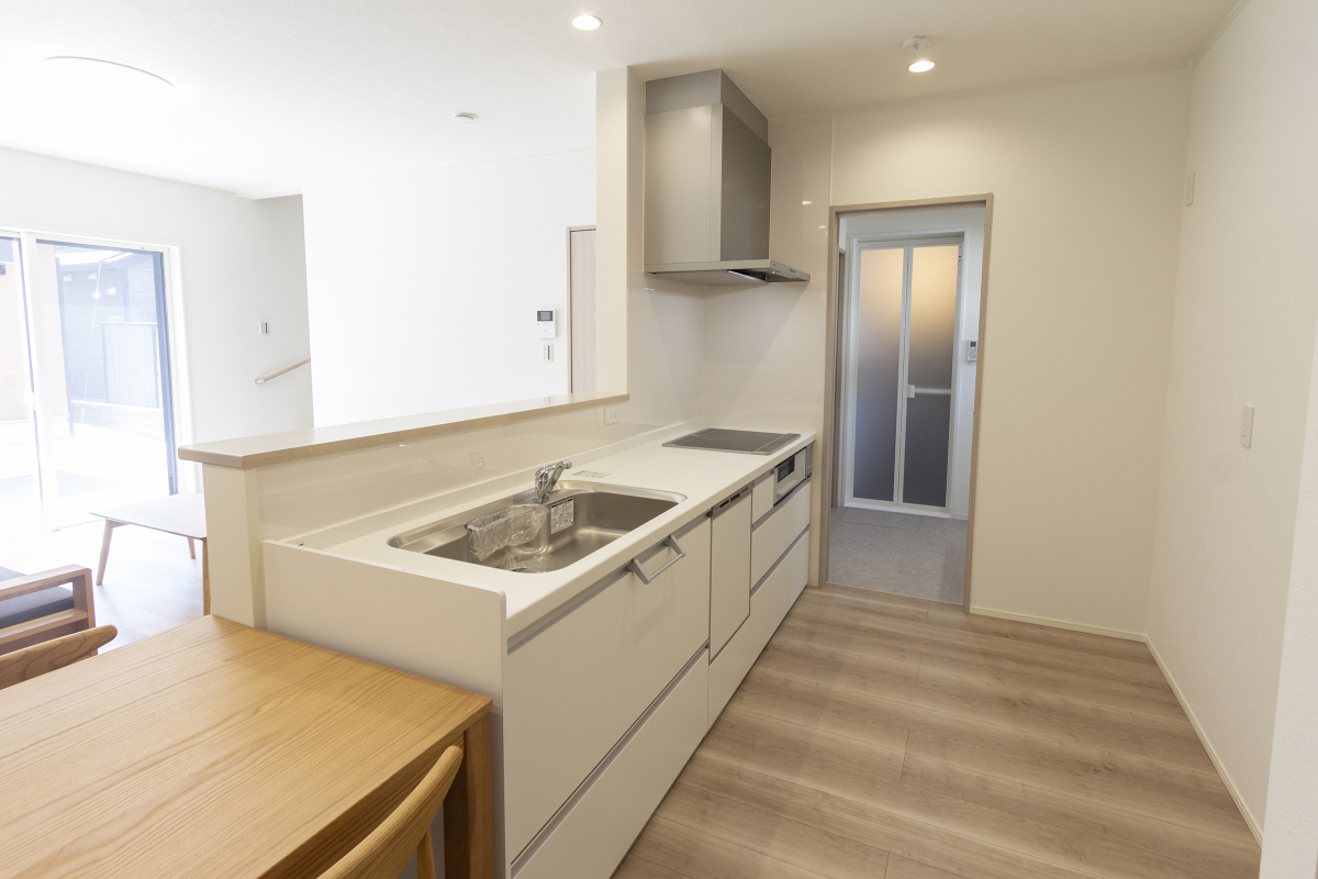 対面キッチンやリビング階段によりコミュニケーションが自然と育まれる明るいLDK。コンロ横の扉から洗面室へショートカットでつながり、家事効率がUP!
