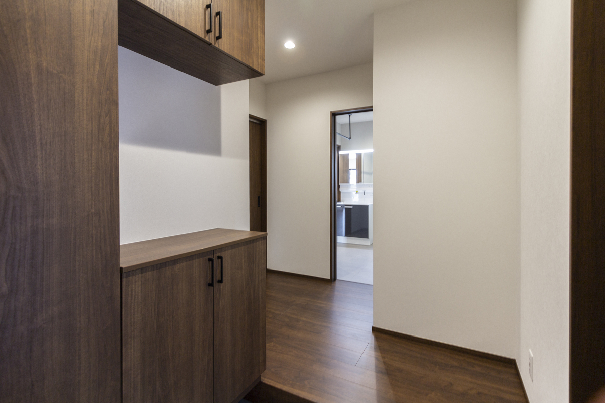 1階ホールにはFCLを設けました。上着などを掛けておくことができ、花粉などを邸内に持ち込まずお出掛け用品をまとめて保管する事ができます。