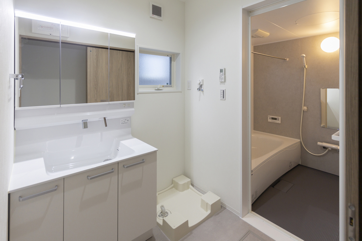 洗面室は玄関からリビングを通らず直接出入りができ、帰宅時の手洗いがスムーズです。洗面化粧台は身支度の際に背後まで確認しやすい3面鏡タイプ。ミラー裏にもアメニティーが収まります。