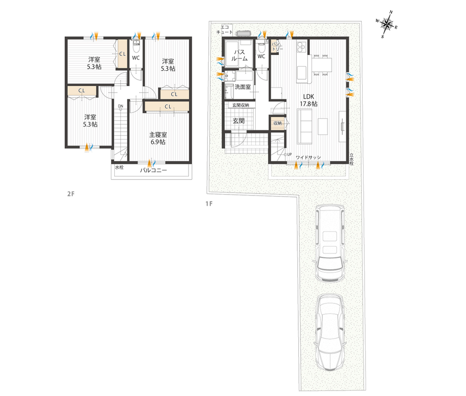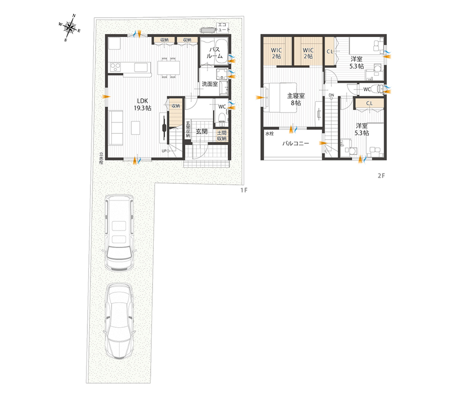 土間収納や階段下、2箇所のWICやダイニングの収納など、たっぷりの収納スペースを確保しています。