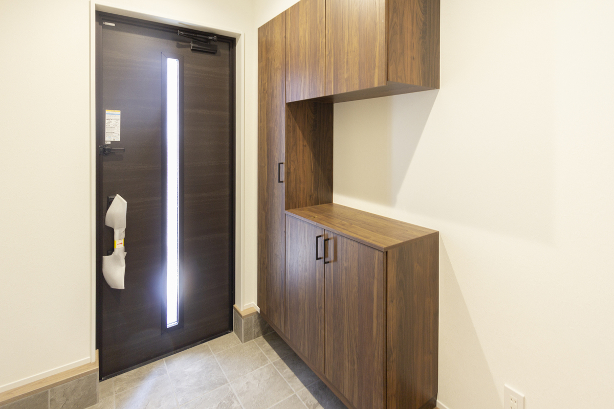 スリットガラス入りの玄関ドアから陽光が注ぐエントランス。コの字...